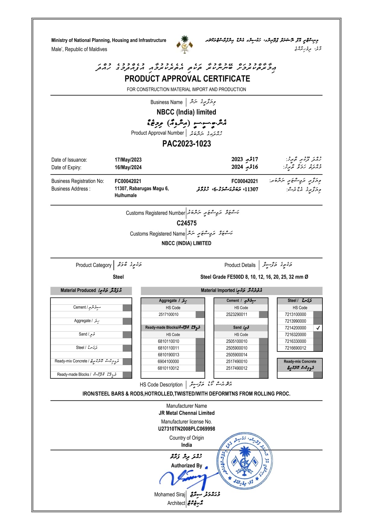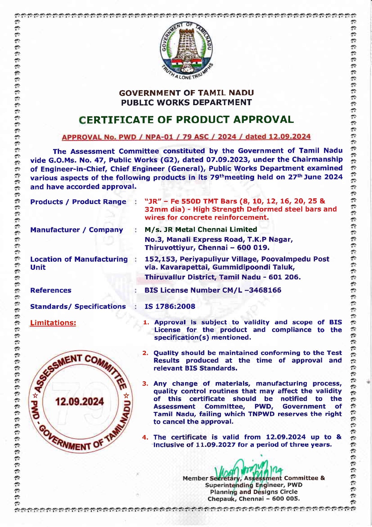 These approvals validate the suitability of JR TMT bars for large-scale government infrastructure projects, including: