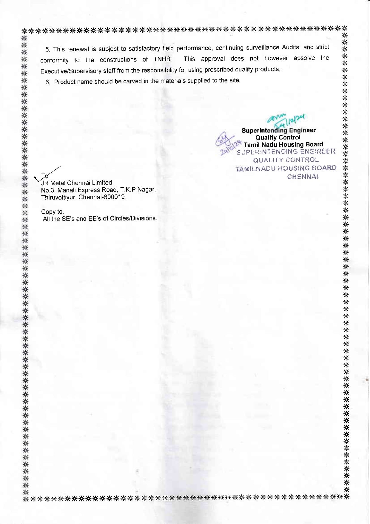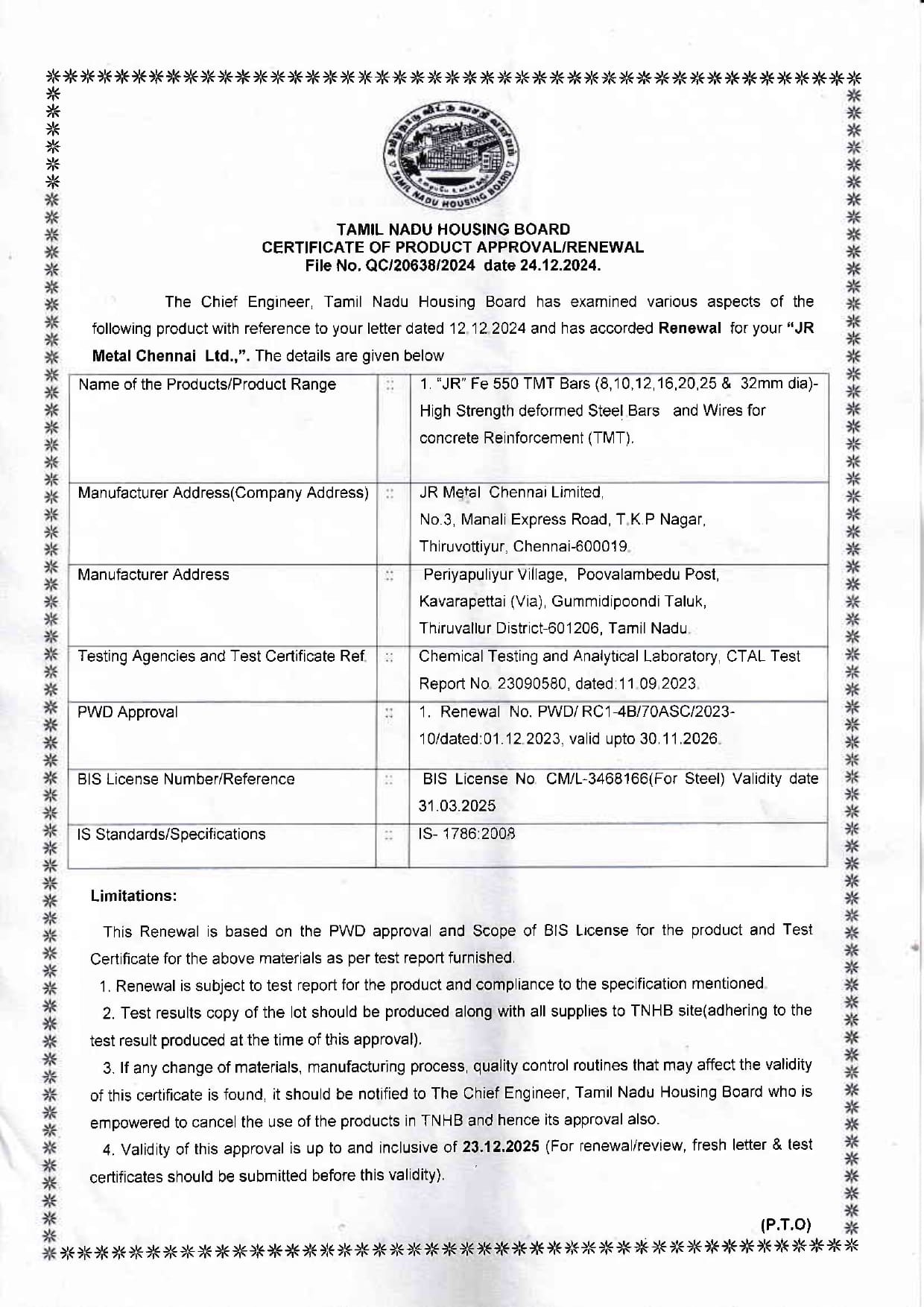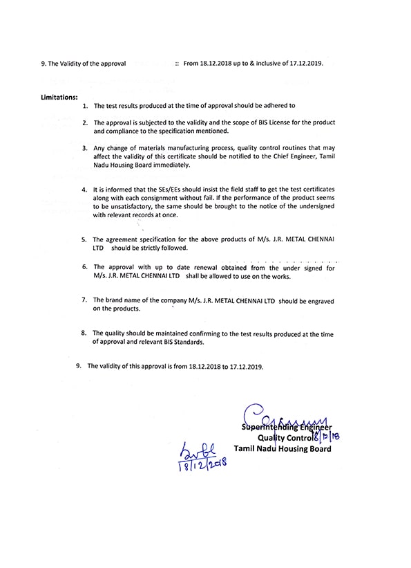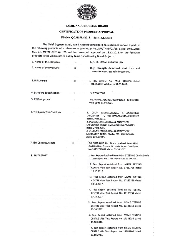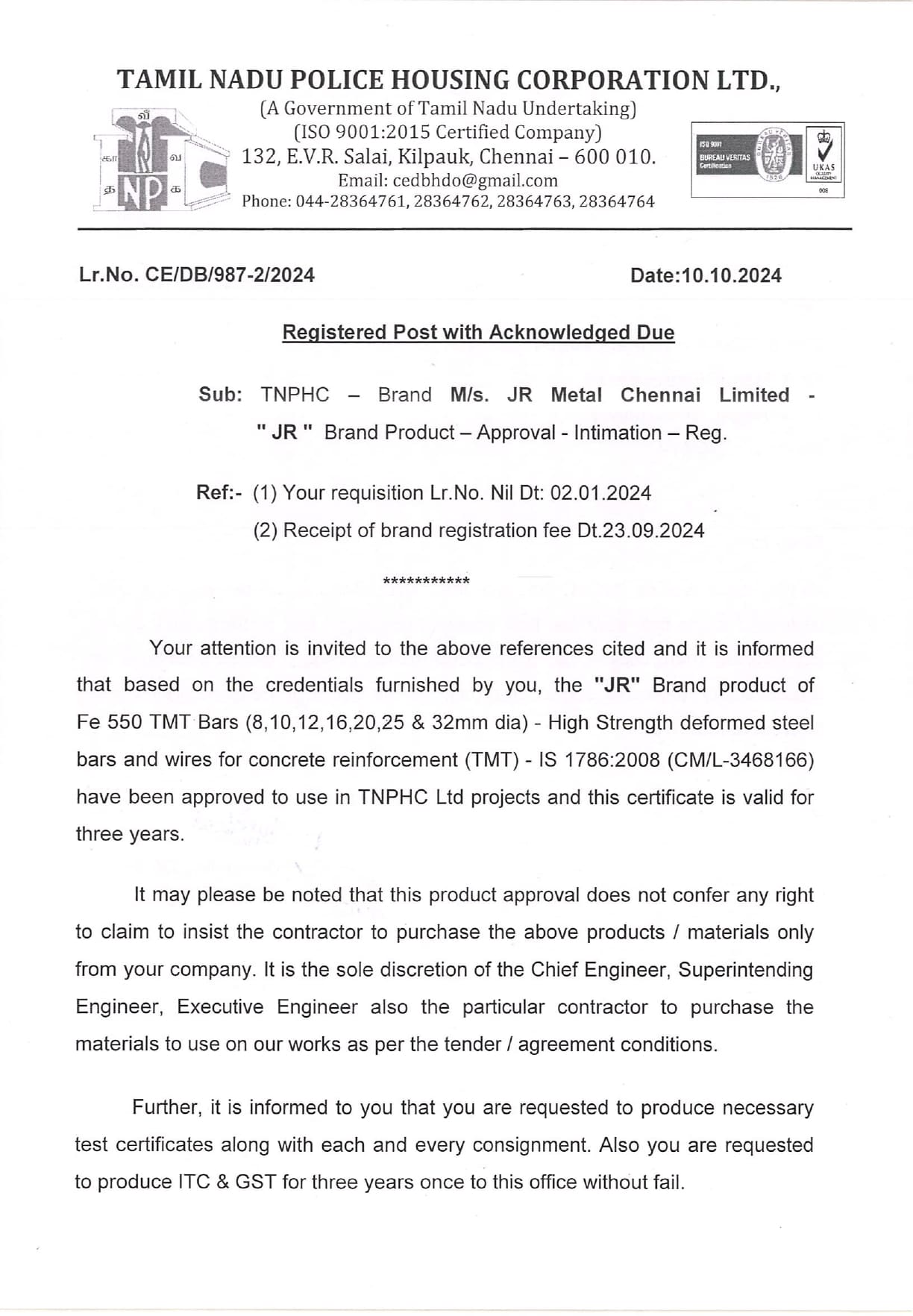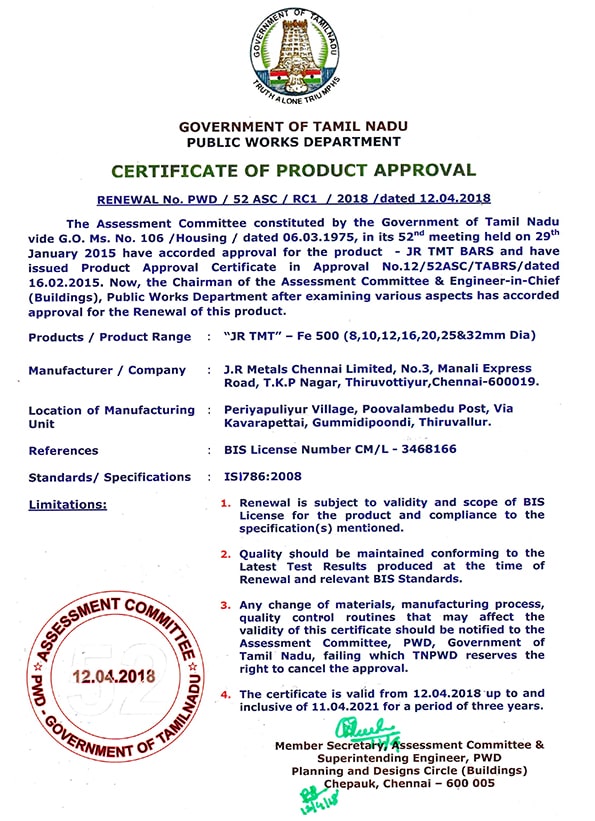 JR TMT bars have earned the trust and approval of various prestigious Central and State Government departments, affirming our commitment to delivering products that meet the highest standards of quality, safety, and performance.